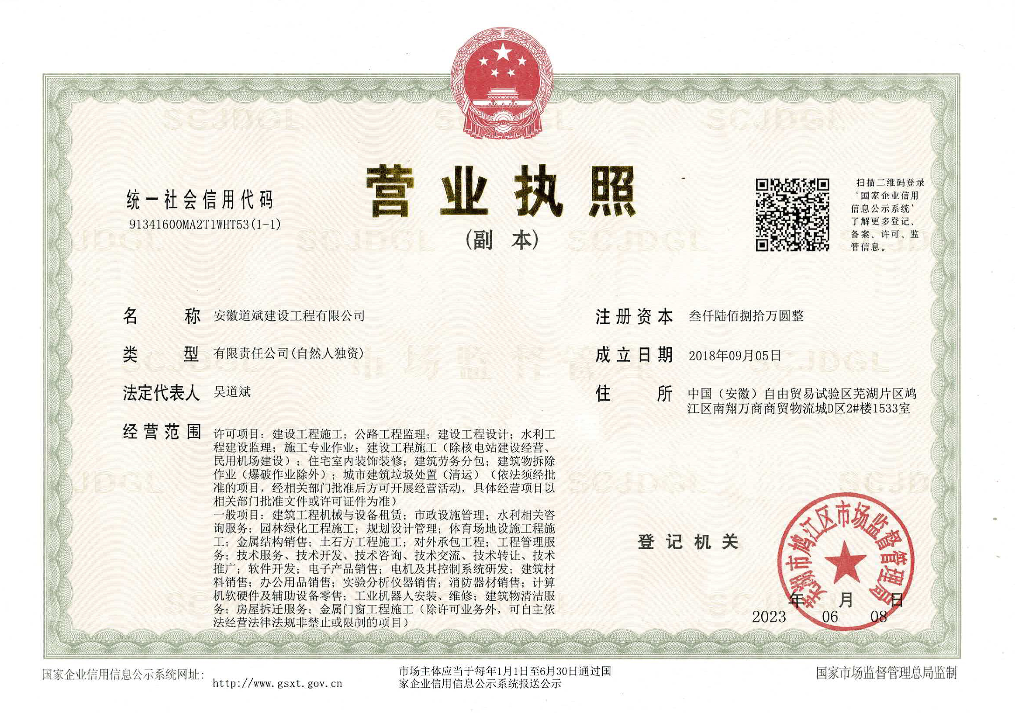 - 安徽道斌建設(shè)工程有限公司成立于2018年4月,主要從事工程施工、工程勞務(wù)、鋼結(jié)構(gòu)施工、市政公用施工,市政施工總承包貳級、地基基礎(chǔ)工程專業(yè)承包貳級、防水防腐保溫工程專業(yè)承包壹級、鋼結(jié)構(gòu)工程專業(yè)承包貳級、建筑裝修裝飾工程專業(yè)承包貳級、建筑工程施...